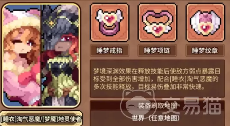 装备搭配是门学问,核心思路是强化“恐惧-弱点”联动。淘气恶魔和地灵使者可以优先共用“睡梦套装”。这套装备的效果非常直接:技能命中后加速敌人弱点暴露,并对已暴露弱点的目标造成额外伤害。这简直是恐惧流“制造弱点-利用弱点”逻辑的完美拼图。