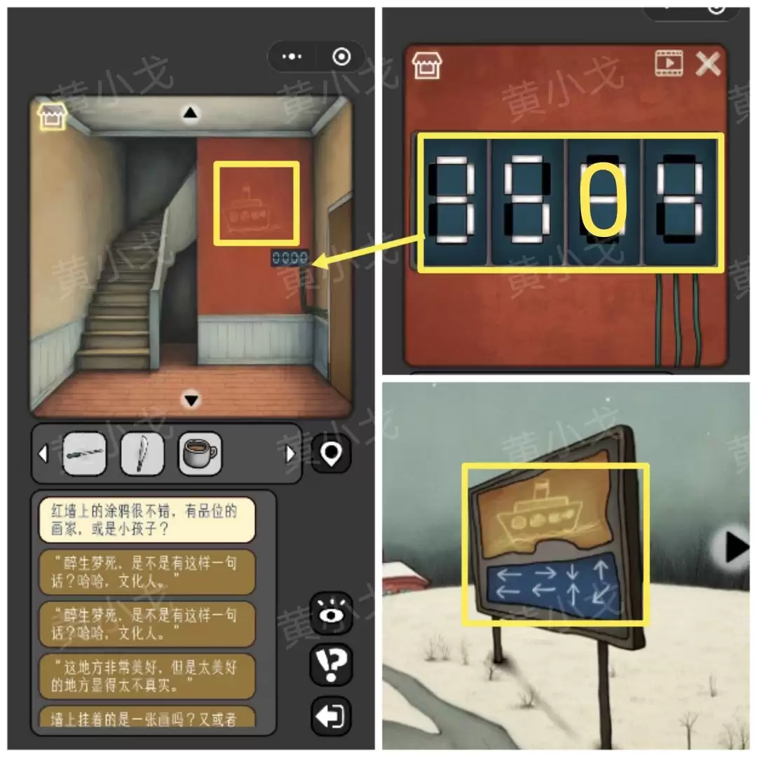 13. 回到木屋楼梯口,点击门上的密码锁。密码线索藏在墙面的涂鸦和“三岔口”路牌上。综合分析后,输入密码:3504。