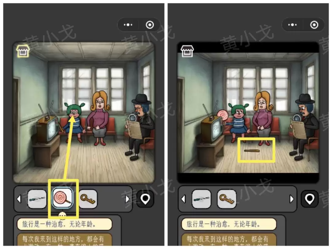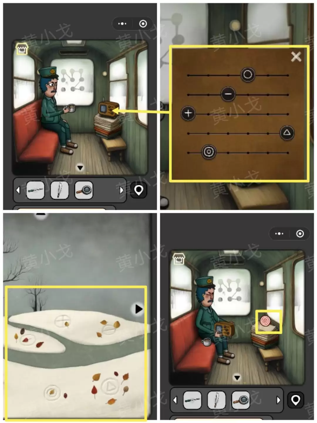 19. 点击收音机上的密码锁。线索来自“岔路口”的符号和周围树叶的数量。根据这些信息,调整对应图案滑块的位置,打开后可以拾取一个【棒棒糖】。