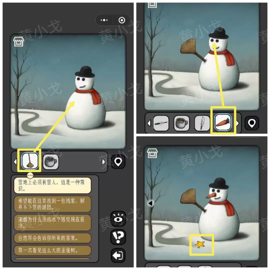 16. 找到雪人,把【扫帚】和【胡萝卜】给它装上,一个完整的雪人就出现了,同时你会获得一个【五角星】。