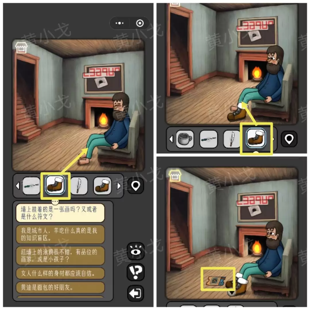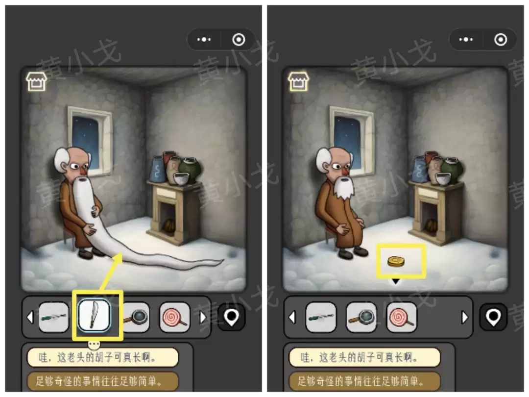 21. 在房间里,用【刀】割断老头的长胡子,会得到一枚【金币】。
