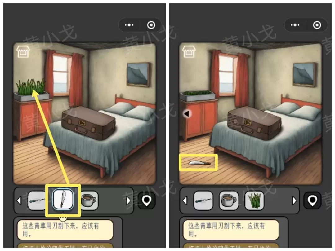 14. 进入卧室,用【刀】割下一把【青草】。对了,用完刀记得再拿上。