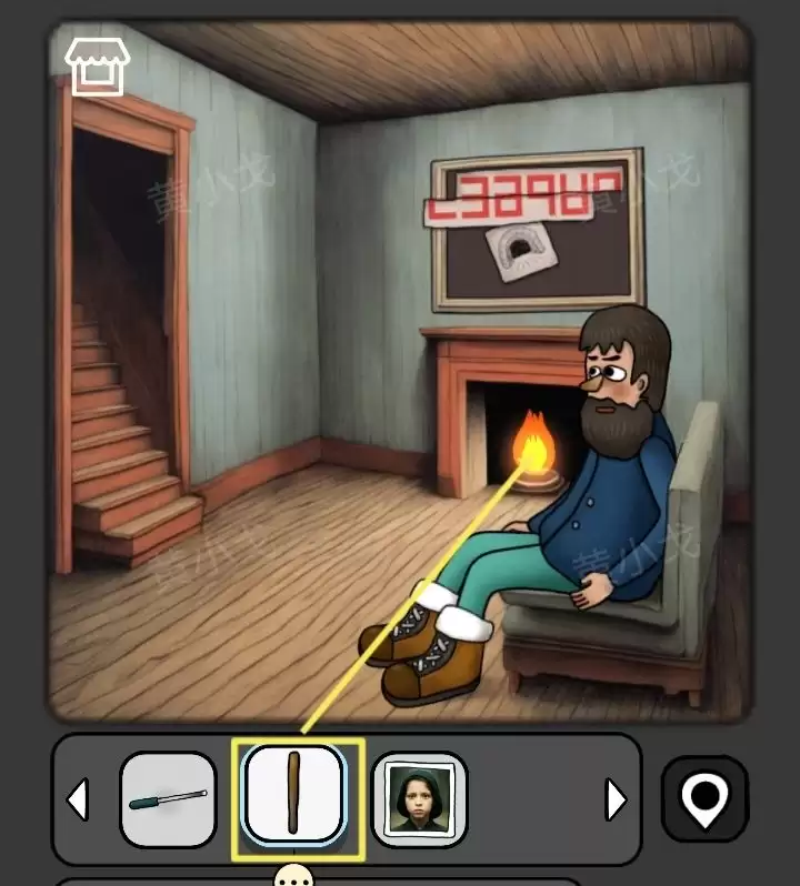 25. 回到客厅,用壁炉里的火点燃【木棍】,得到【点燃的木棍】。