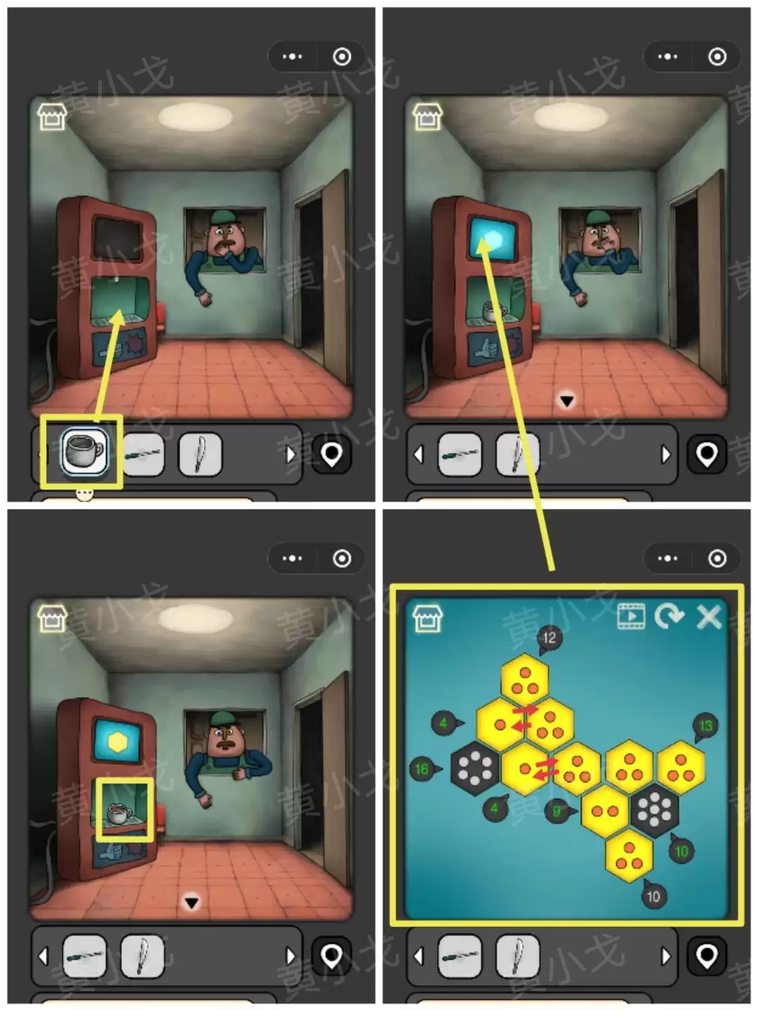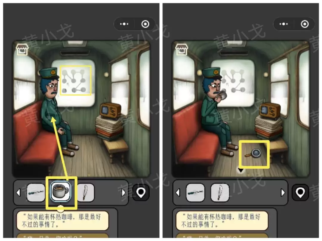 12. 进入候车室,把【杯子】放在咖啡机上。接着点击操作面板,完成一个小游戏,就能得到一杯【咖啡】。