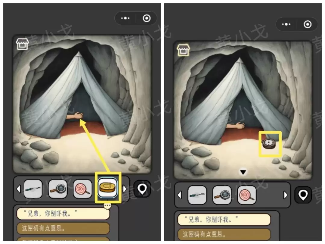 2. 来到山洞,点击地上的机关。刚才在客厅看到的数字派上用场了,直接输入密码:23848,门应声而开。