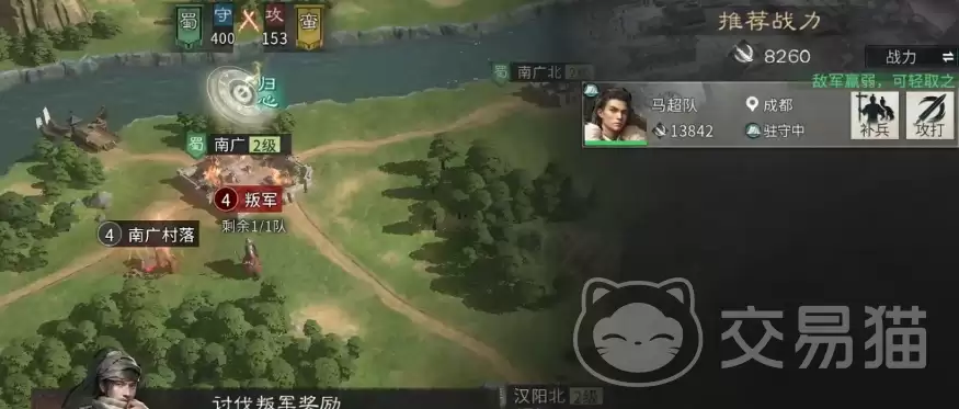 “讨伐叛军”:这是游戏初期开放的核心日常玩法,也是获取元宝、粮草及村庄占领权的主要途径。需要特别注意,9级叛军是一个阶段性难点,必须将民心等级提升至8级、完成“碧蓝”品质升阶并激活对应被动技能后,才能稳定攻克。推荐战力阈值约为35000点,因此开服首日,应集中资源优先将民心提升至8级,以突破此关键瓶颈。