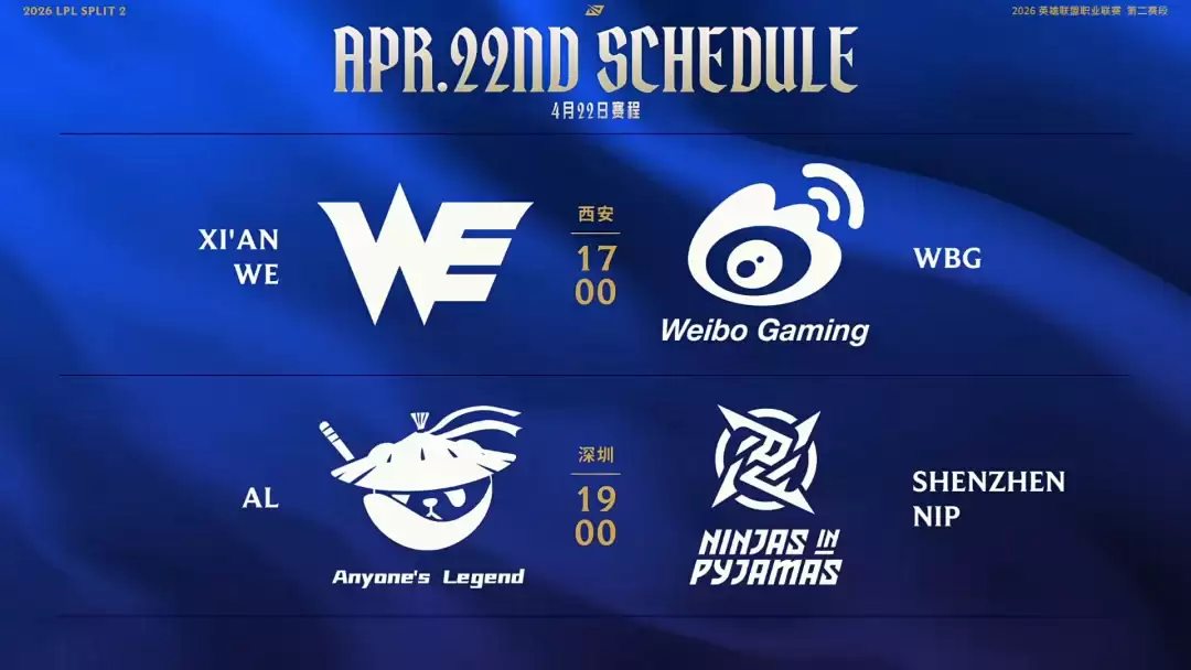 4月22日关键赛程:WE对阵WBG,AL迎战NIP