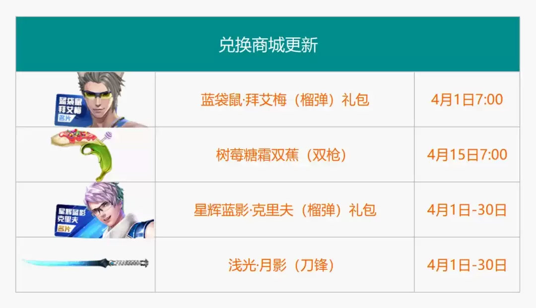 1、04月01日7:00,商城将上架「蓝袋鼠·拜艾梅(榴弹)礼包」;04月15日7:00,将上架「树莓糖霜双蕉(双枪)礼包」。
