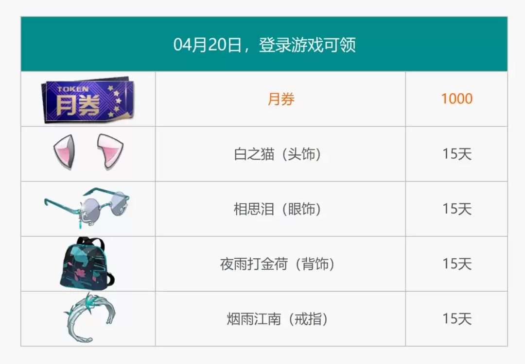 5、04月20日:登录领取〔1000月券〕及唯美饰品套装(15天):〔白之猫(头饰)〕、〔相思泪(眼饰)〕、〔夜雨打金荷(背饰)〕、〔烟雨江南(戒指)〕。