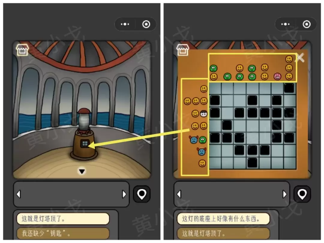 登上塔顶,点击底座上的机关。这里需要结合之前电视画面上看到的图案数字线索,根据机关上的图案提示,完成一个数织(Nonogram)小游戏。这是整个灯塔迷雾的最后一道关卡,解开它,真相或许就在眼前。