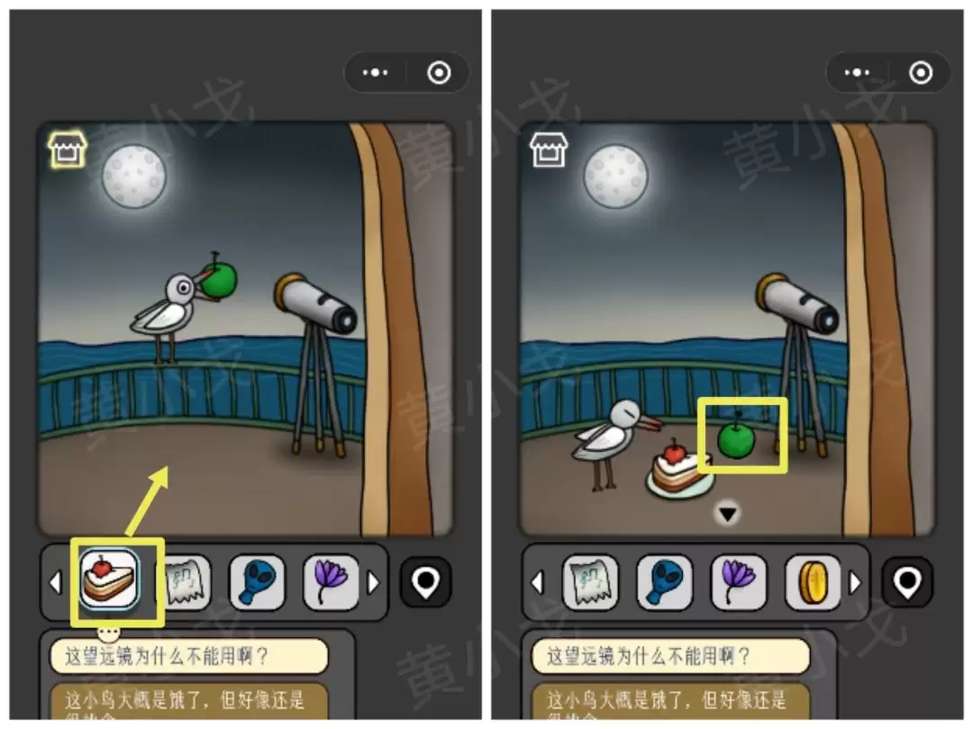接着,把【蛋糕】放在地上喂鸟,鸟会回赠你一个【青苹果】。