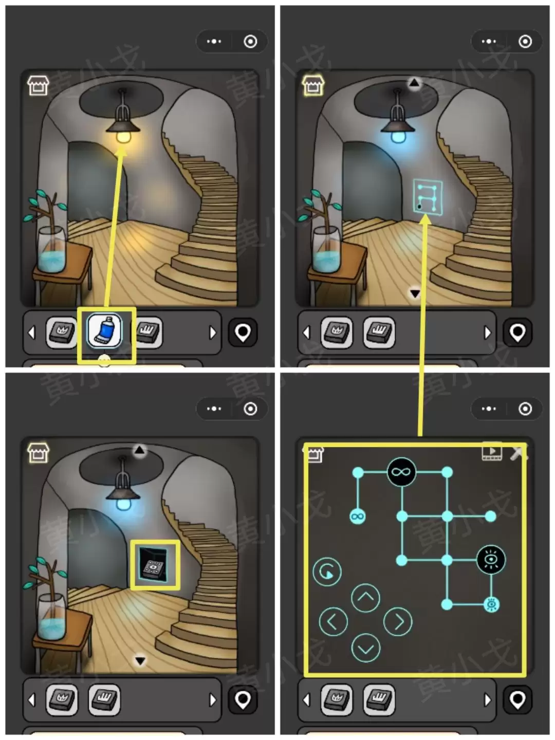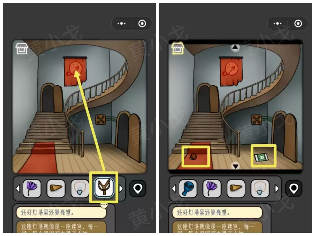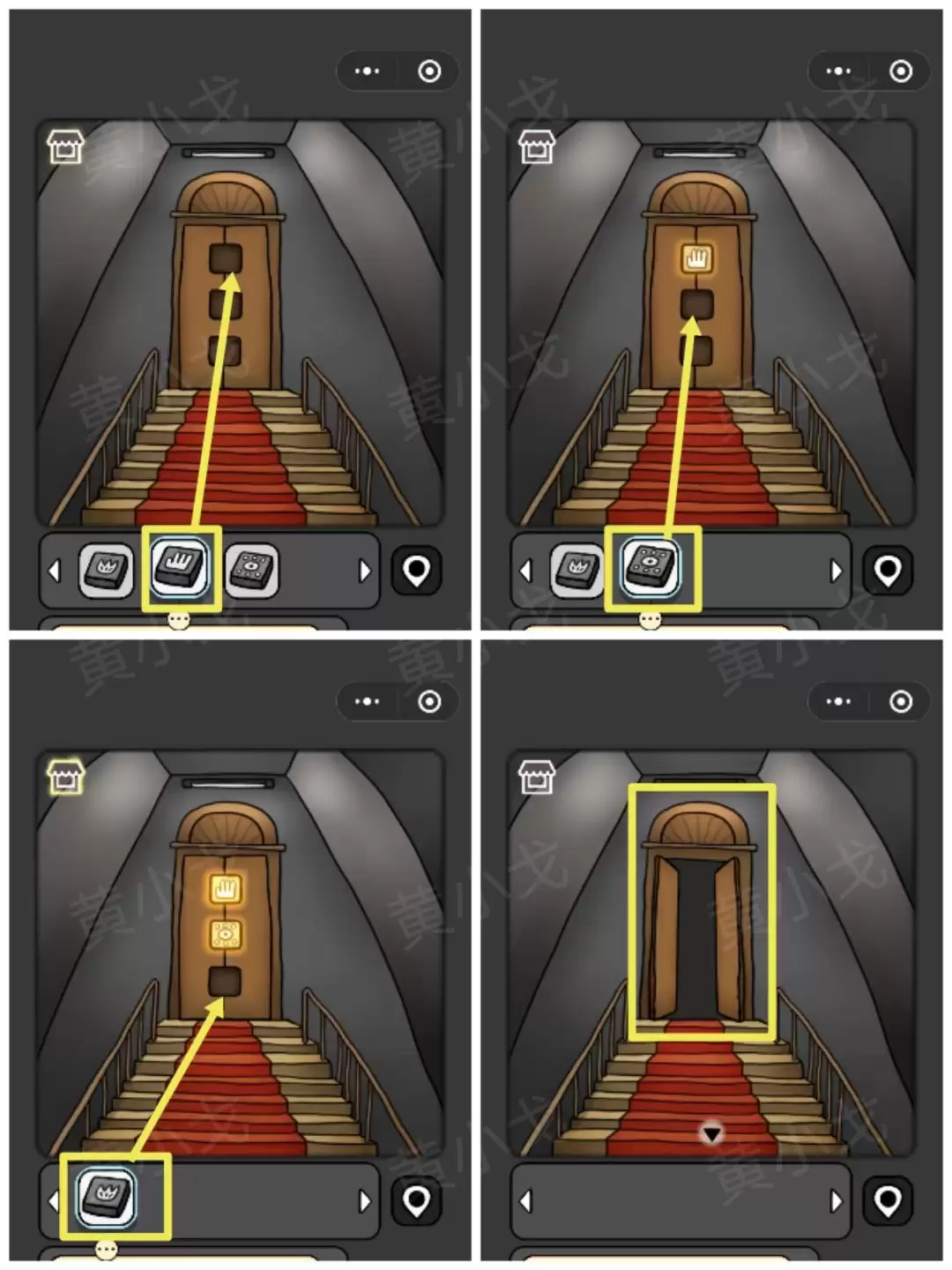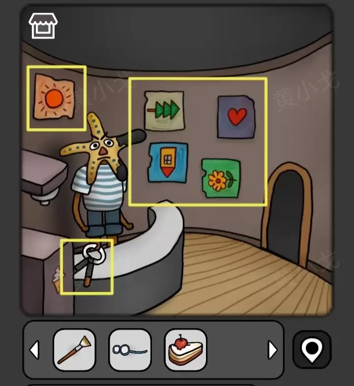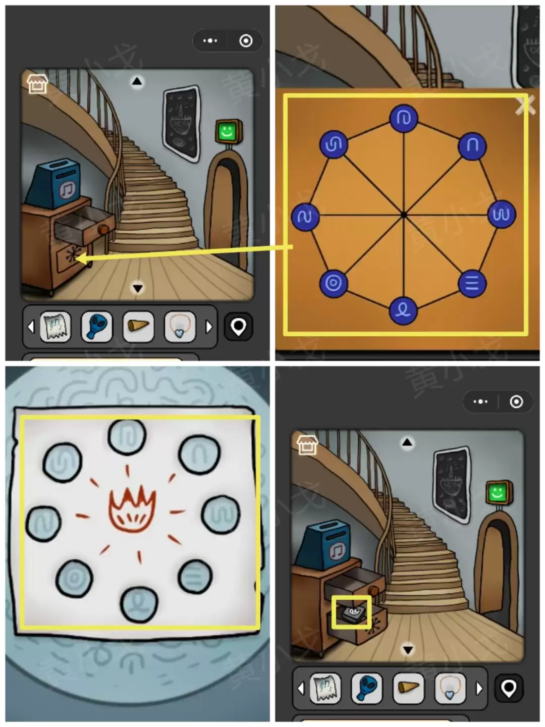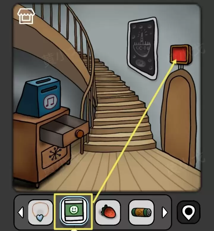 再次回到一楼楼梯口,点击门上的机关。现在,三楼甜品店墙上的画派上用场了。解谜思路是这样的:画中每个物品的朝向,直接对应了机关上该物品应摆放的位置。比如,树木朝右,就把树木图案移到右边;爱心朝上,就移到上方;屋子朝下,移到下方;花朵朝左,移到左方;太阳则在中间。按此逻辑调整,门就会打开。
