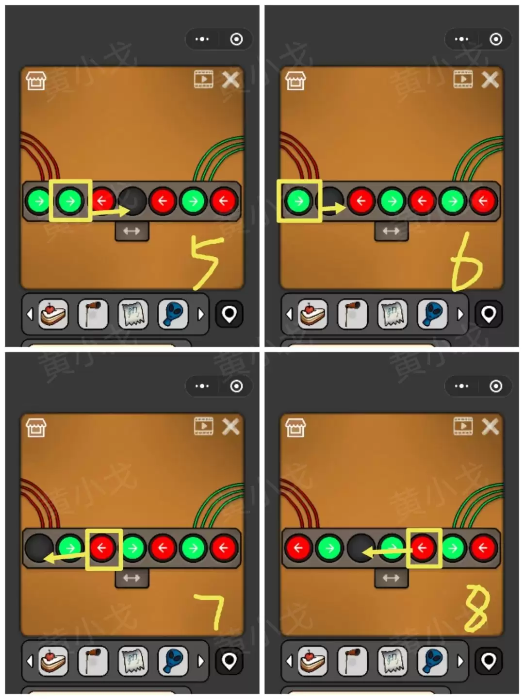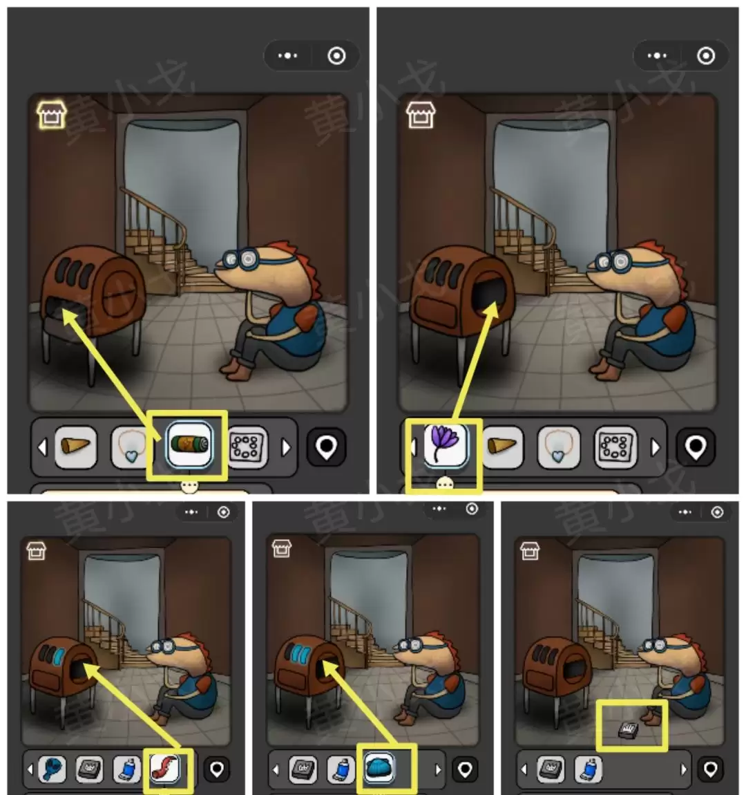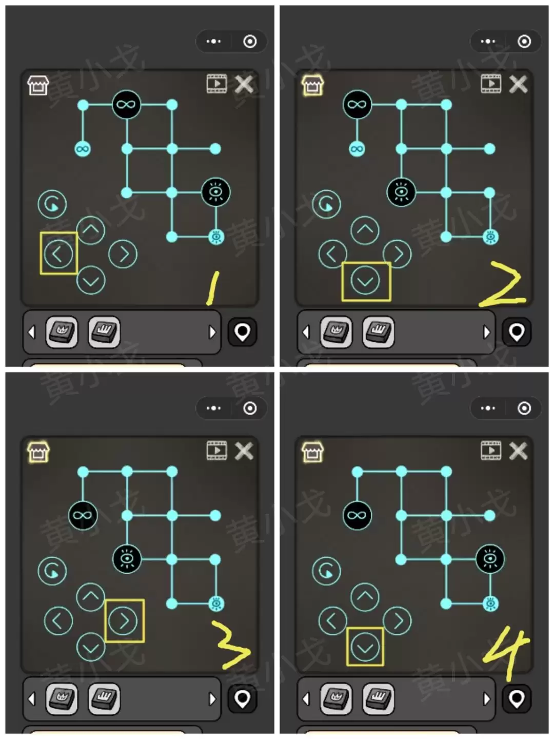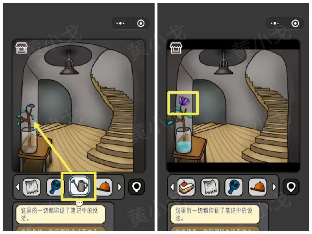 再次回到一楼楼梯口,点击门上的机关。现在,三楼甜品店墙上的画派上用场了。解谜思路是这样的:画中每个物品的朝向,直接对应了机关上该物品应摆放的位置。比如,树木朝右,就把树木图案移到右边;爱心朝上,就移到上方;屋子朝下,移到下方;花朵朝左,移到左方;太阳则在中间。按此逻辑调整,门就会打开。