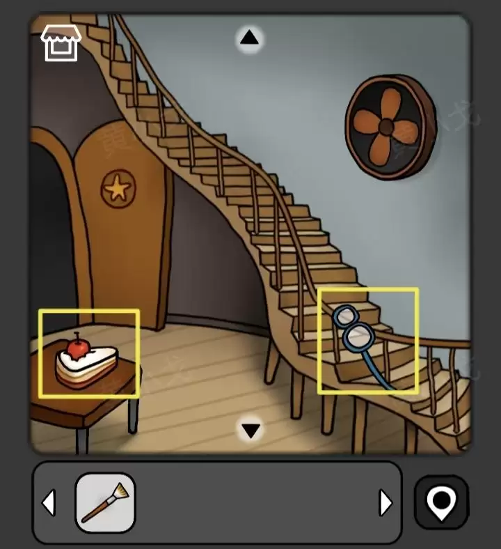 沿着楼梯向上,来到三楼楼梯口。这里的桌子上放着一块【蛋糕】,而楼梯扶手上则挂着一副【眼镜】。两件物品都拿上,谁知道在哪个角落会用得上呢?