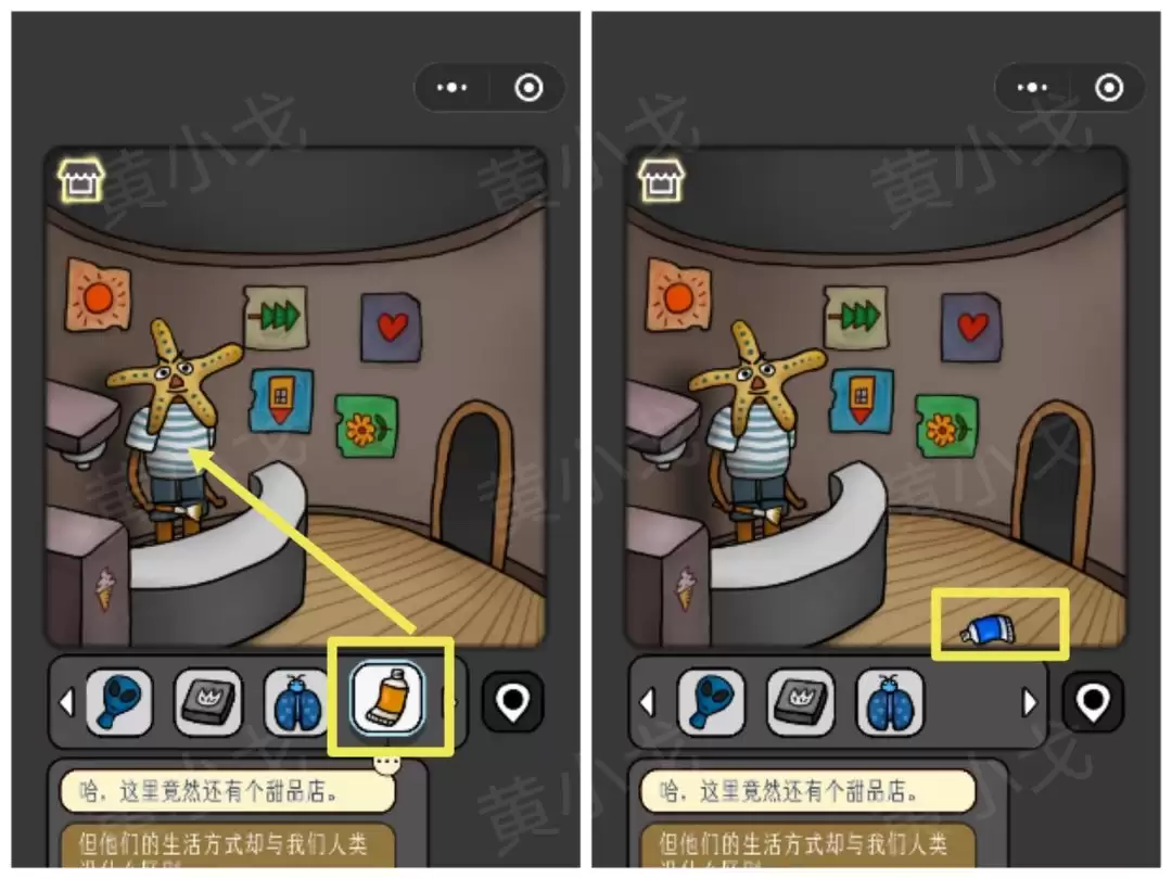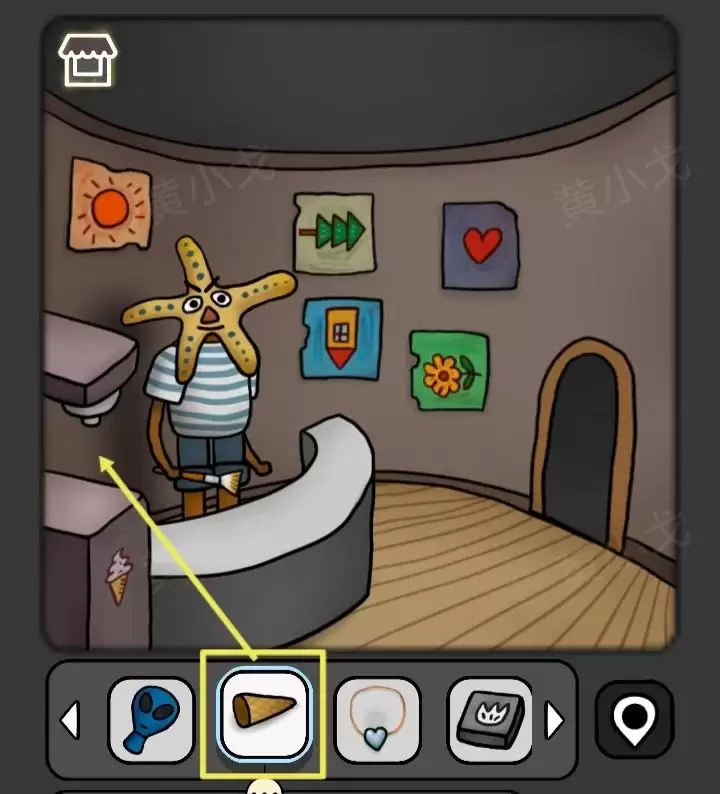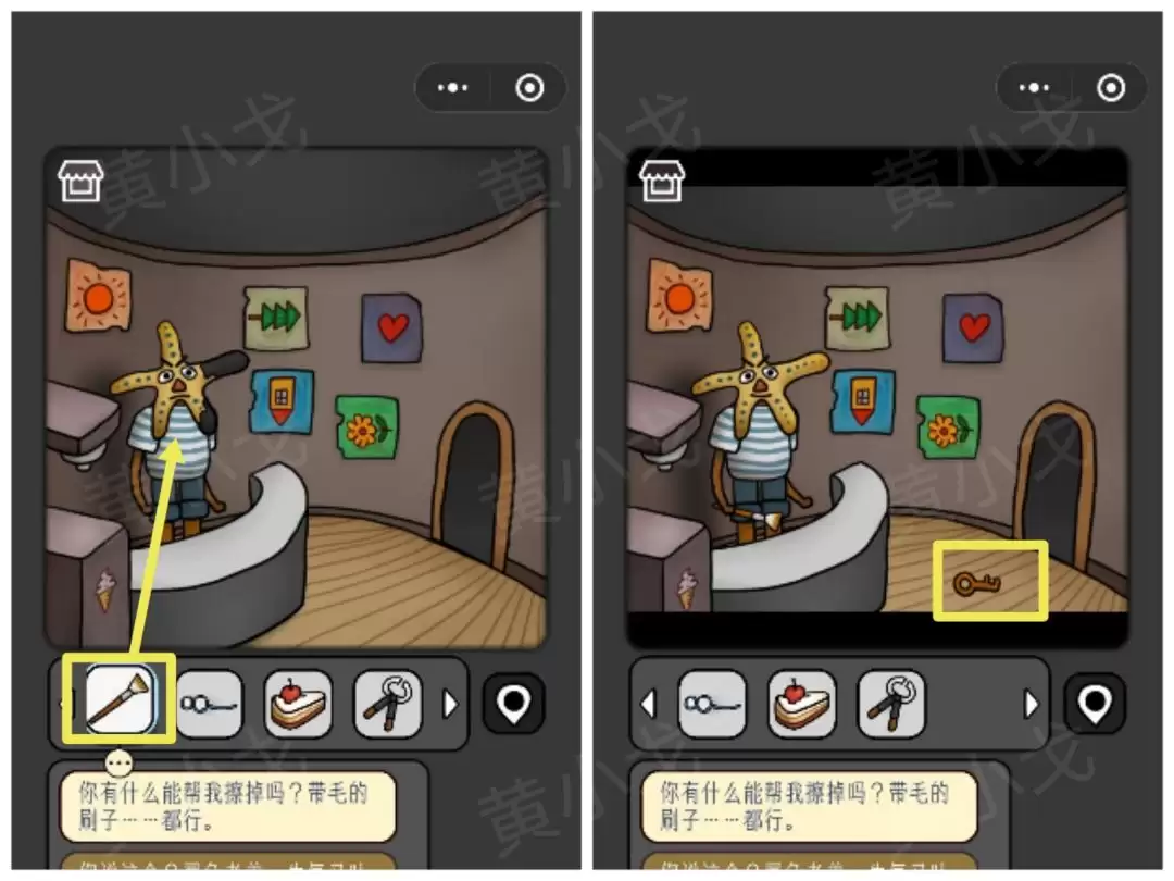 接下来,找到店里的海星大叔,把刚才捡到的【画笔】交给他。作为回报,你会得到一把【钥匙】。