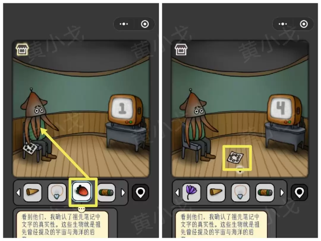 回到一楼右侧房间,把【草莓】给章鱼人,他会给你一张【纸条】。