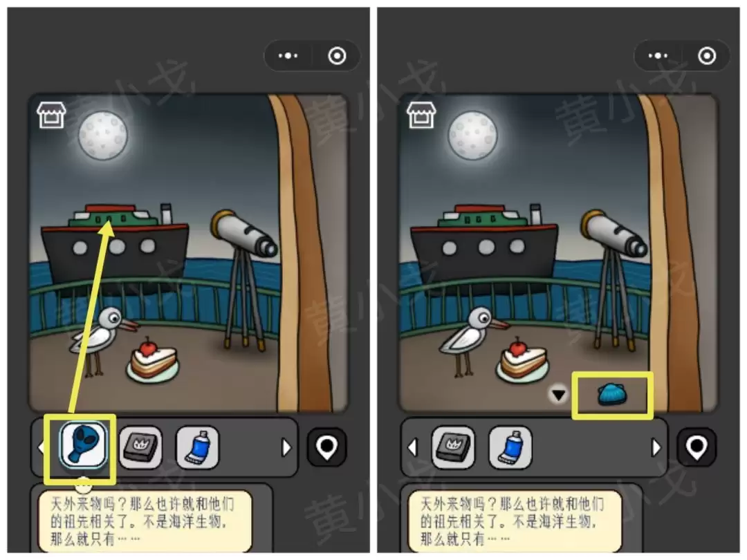 来到灯塔外,使用【喇叭】对准天空,赶下一只【会飞的鱼】。这游戏的世界观,总是这么出人意料。