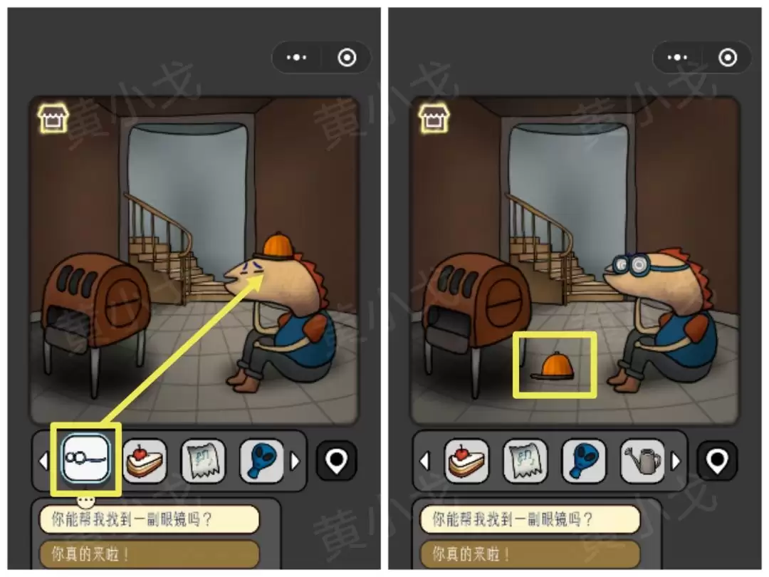 然后,把之前在楼梯口找到的【眼镜】交给这里的男人,他会给你一顶【帽子】。