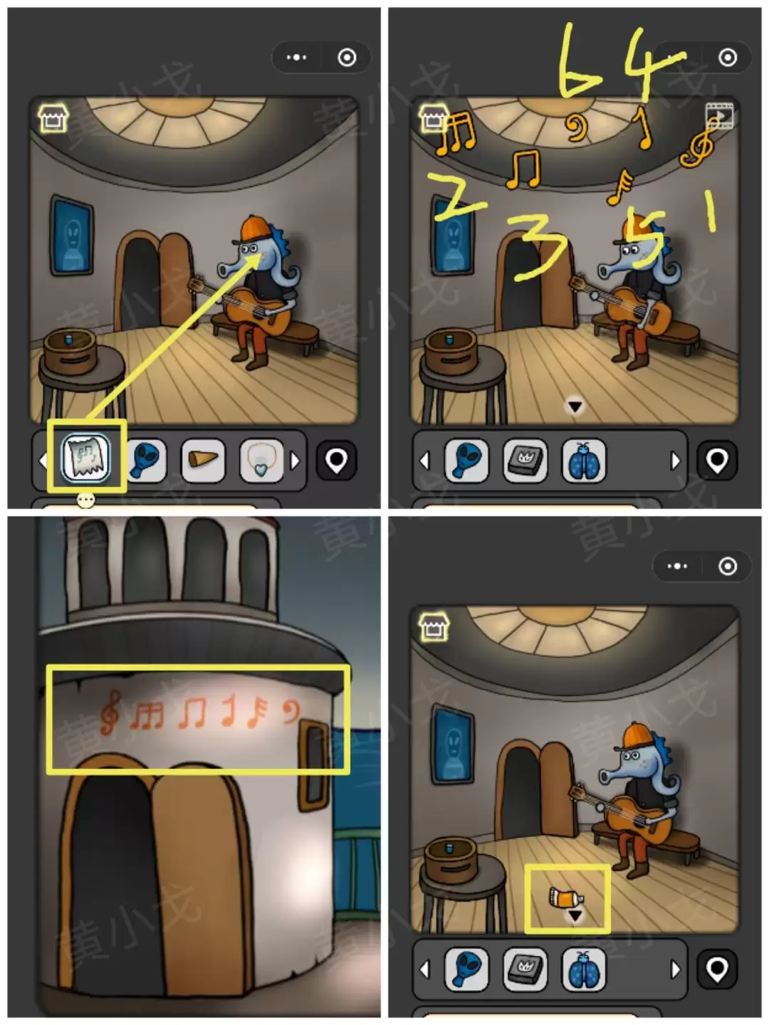 回到一楼左侧房间,将【乐谱】交给海马人。然后,根据之前在二楼露台灯塔墙上看到的音符线索,按正确顺序按下音符。完成后,记得拾取地上出现的【颜料】。