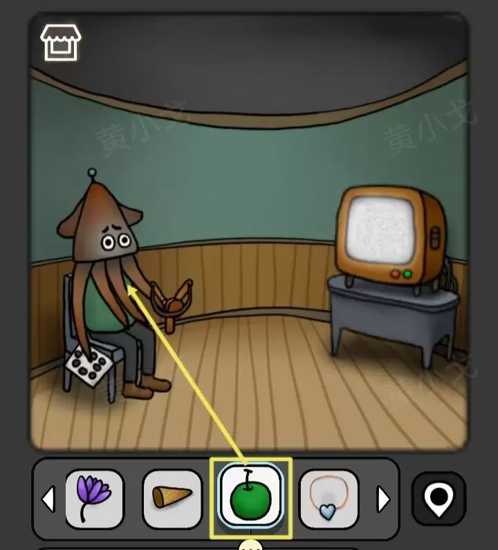 然后,将【青苹果】交给房间里的章鱼人,换取一个【弹弓】。