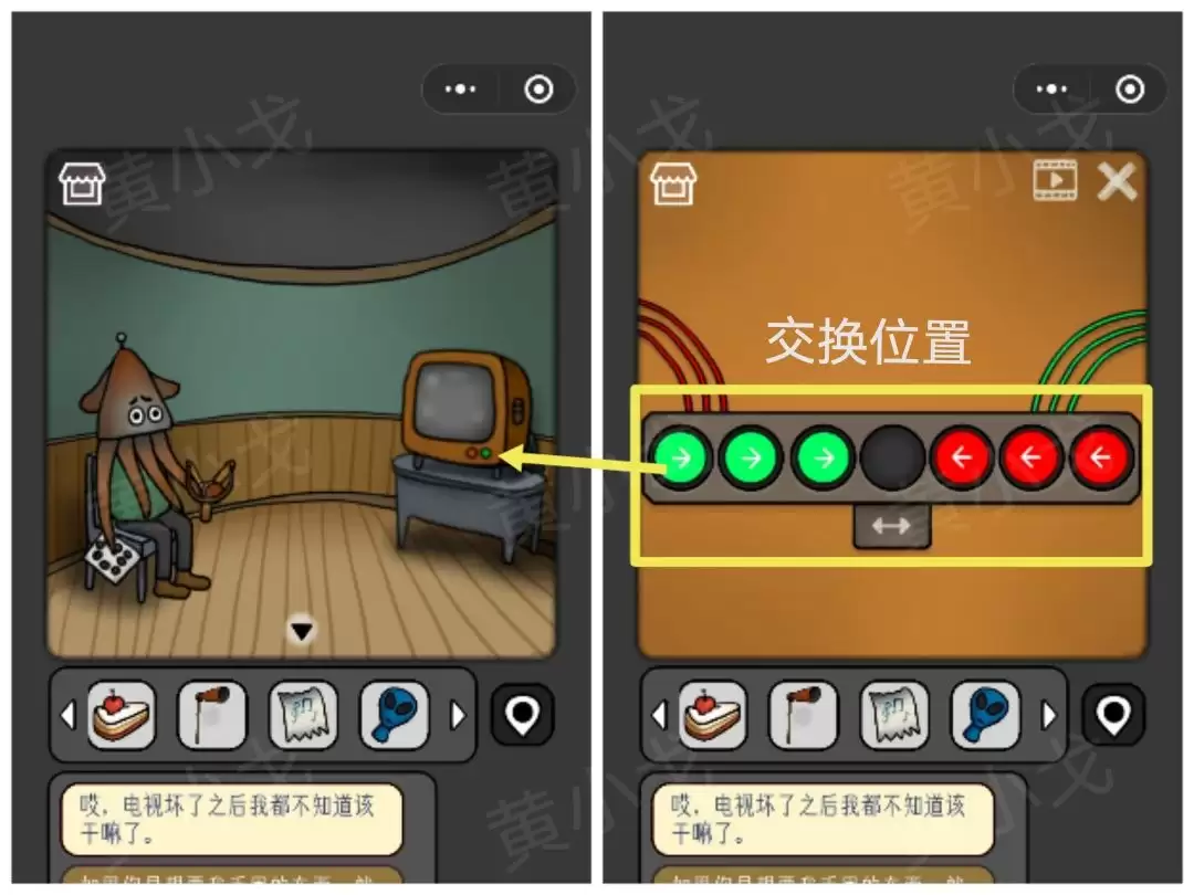 进入右侧房间,点击电视开关,完成一个交换按钮的小游戏。这个过程需要一点耐心和逻辑。