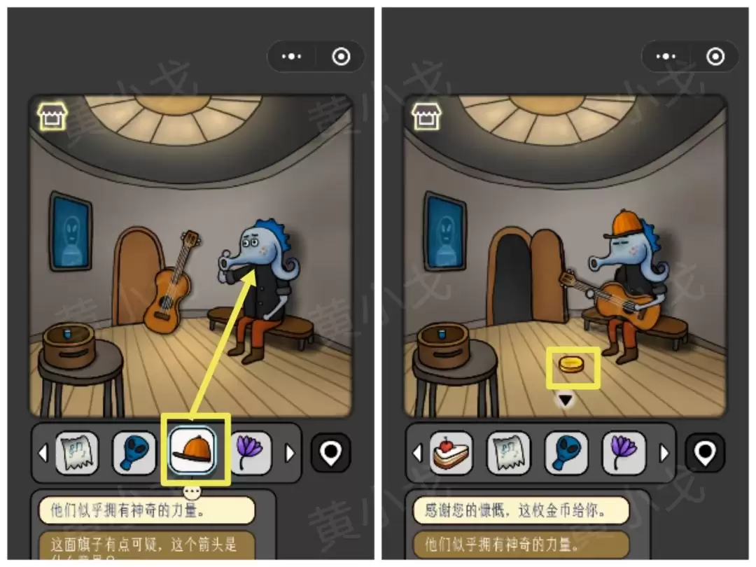 返回左侧房间,将【帽子】交给海马人。他会给你一枚【金币】,并为你打开一扇新的门。