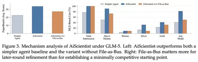 机制分析进一步说明了这一点。移除File-as-Bus后,AiScientist在PaperBench上下降6.41分,在MLE-Bench Lite上“任意奖牌”率下降31.82个百分点。这表明,状态连续性并不是一个「锦上添花」的设计,而是长程研究工程里真正影响系统能否持续推进的关键因素之一。