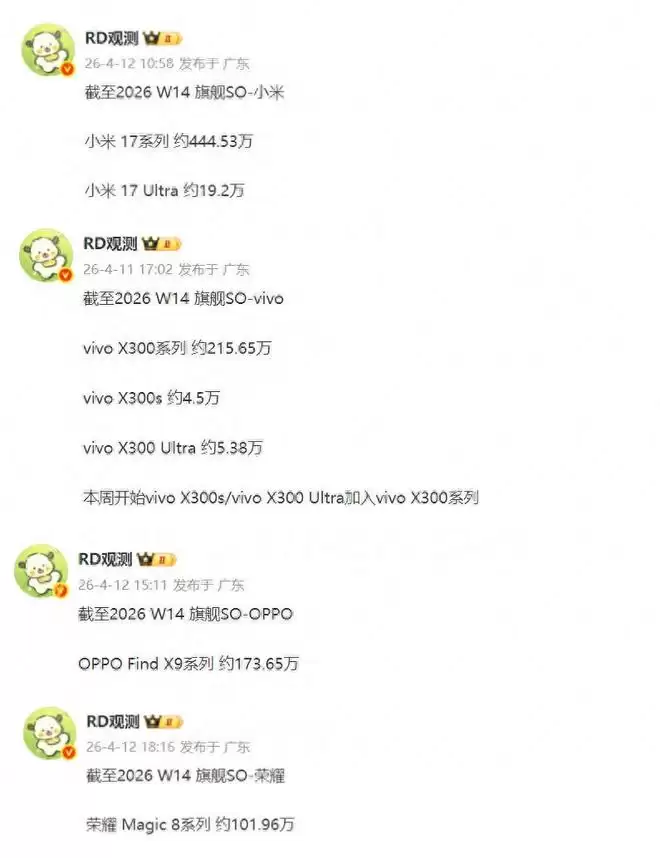行业数据机构“RD观测”发布的周度销量报告,是洞察手机市场动态的关键指标。继整体排名与单品Top30榜单后,其针对主流品牌旗舰系列的深度数据也已出炉。本文聚焦分析小米17系列、vivo X300系列、OPPO Find X9系列及荣耀Magic8系列这四大国产旗舰的最新市场表现。