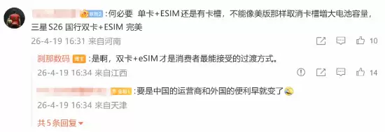 相关爆料迅速成为科技社区热议焦点。部分资深用户提出更激进的设想:“与其保留折中的单卡槽,不如效仿美版机型彻底取消,将内部空间让渡给电池。三星Galaxy S26国行版提供的双卡+eSIM方案,在过渡期体验上显然更为完善。” 爆料博主对此回应称,双卡与eSIM并存确实是当前最符合用户习惯的过渡形态。这反映出市场对eSIM技术落地节奏的核心诉求:在保障现有使用惯性的前提下,稳步向无线化未来演进。
