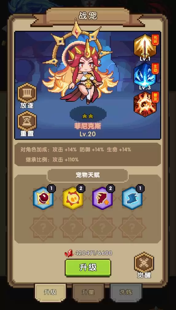 「升星」:当你获得重复的宠物时,多余的角色就可以用于升星。每次升星,都能随机提升一次现有天赋,或者直接获得一个全新的天赋。
