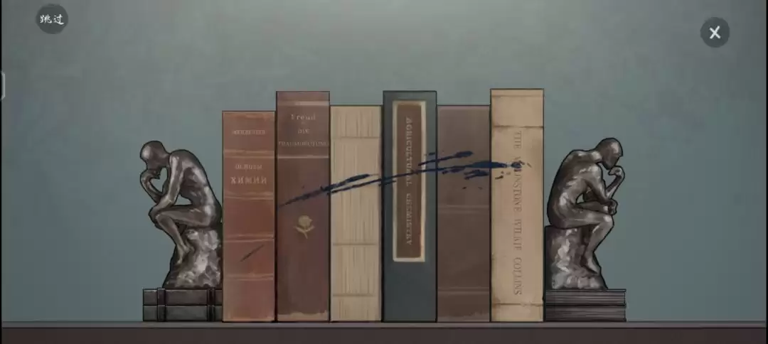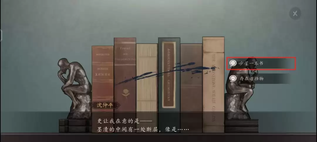注意书堆上的墨渍。你会发现,墨迹中间有一处明显的断层,这暗示了什么?没错,就像是原本在那里的某本书被抽走了。