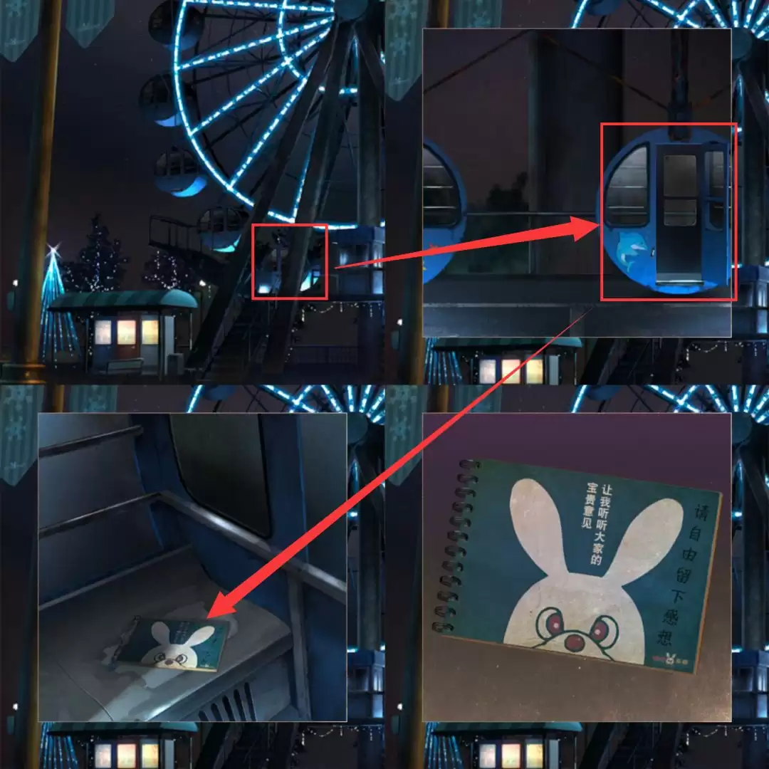 首先,进入场景后,你会看到一个摩天轮。重点留意那些开着门的座舱。进去其中一个,你会在里面发现一本留言本。拿起来,耐心地翻看每一页。翻到后面,你会从本子里得到一张特殊的纸——上面布满了不规则的孔洞。