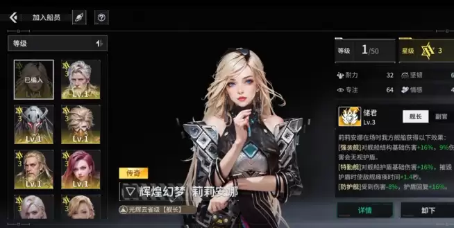 属性成长方面,莉莉安娜同样站在了天花板级别。1级初始属性就颇为亮眼:耐力32、专注64、情感43。当等级提升至50级后,各项属性会迎来飙升,无论是输出向还是辅助向的属性都足够扎实,没有任何明显的短板。作为一名三星传奇船员,她的养成上限非常高,后期属性拉满后,完全可以碾压同级别的其他舰船角色。从前期开荒到后期毕业,她都能全程陪伴,完全不用担心会被版本淘汰。可能有人会疑惑她的具体定位——其实,她就是那个能让队伍“肉到打不动”的最强奶妈。即便是各种混搭阵容,她也能完美适应,根本无需多虑。