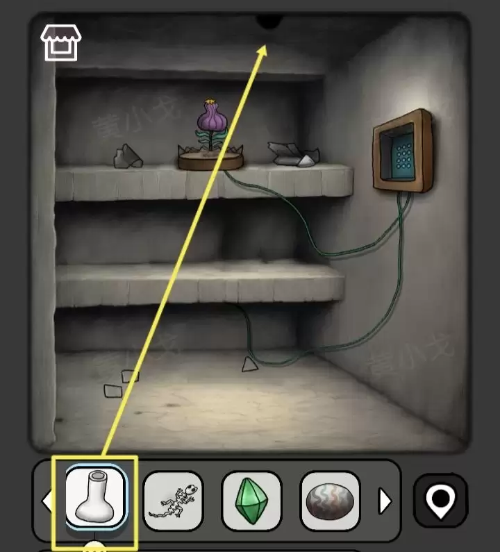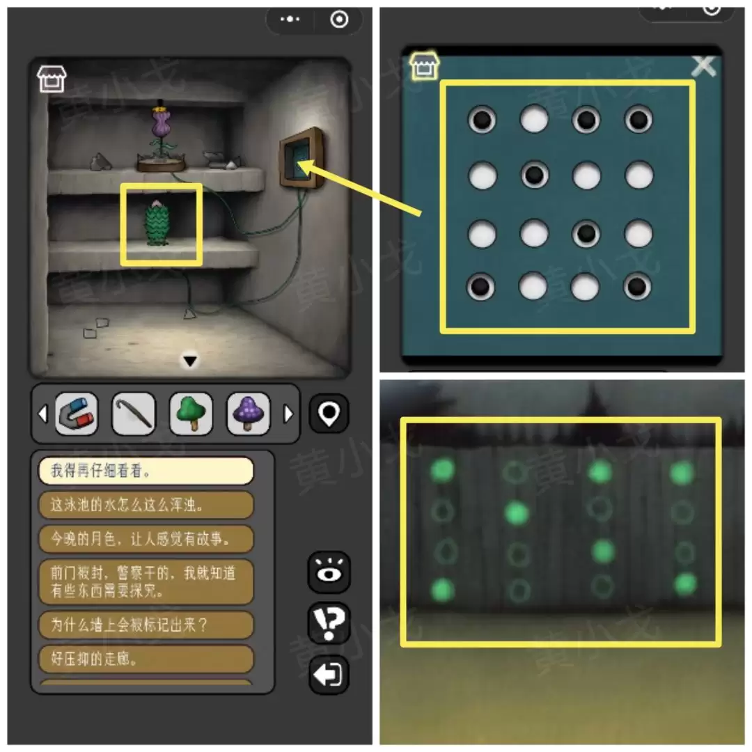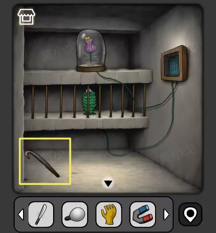 31. 再次回到陈列室,点击墙上另一个机关。这次,要根据泳池墙上的图案来调整。机关解开后,围栏打开,拿到里面的【植物】。