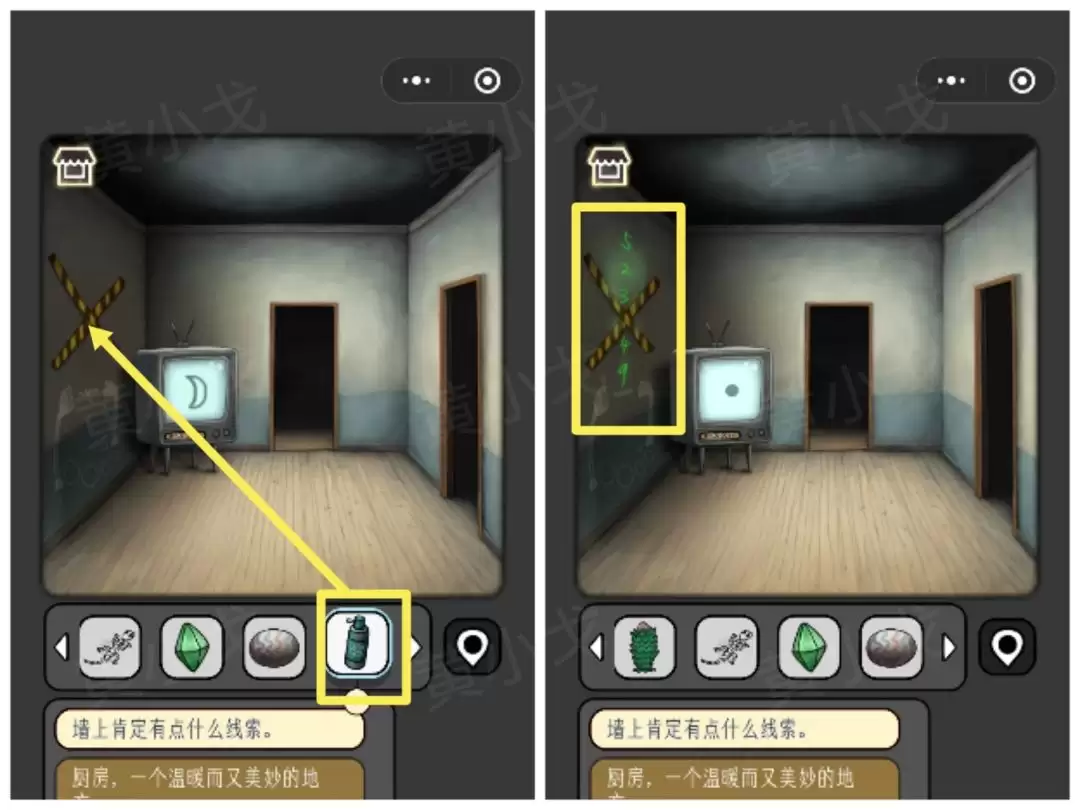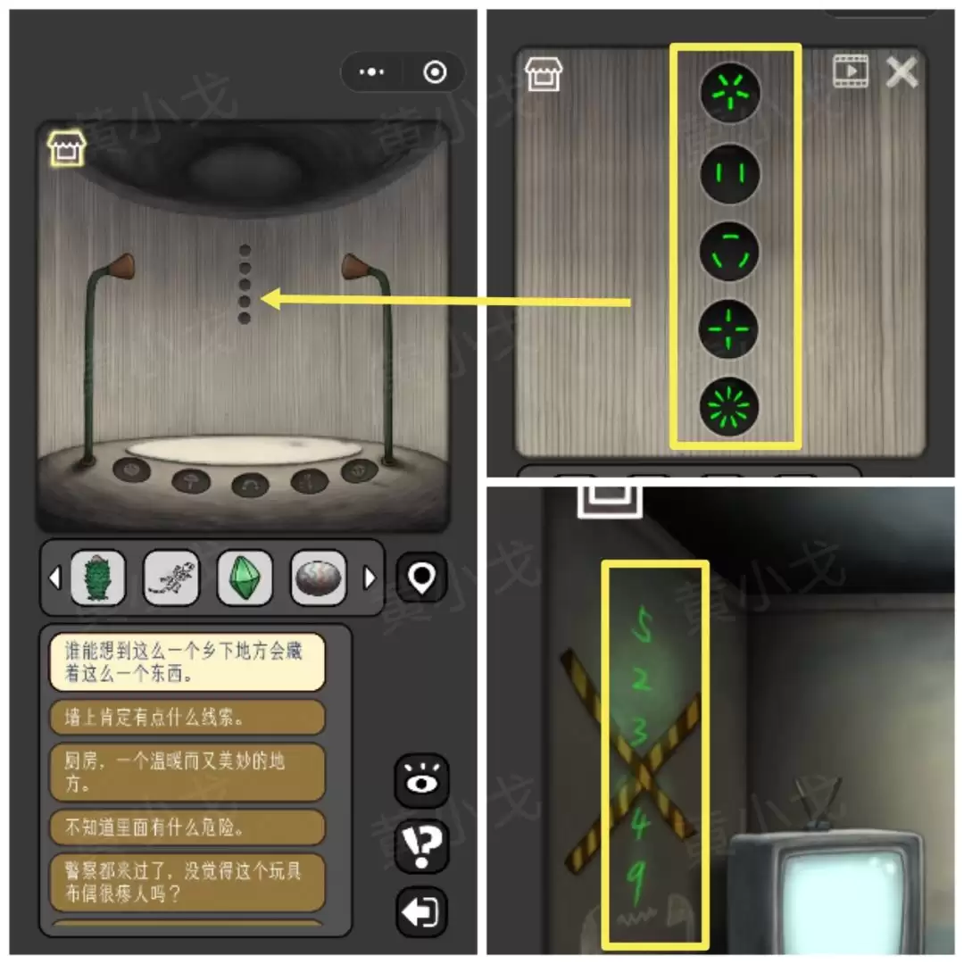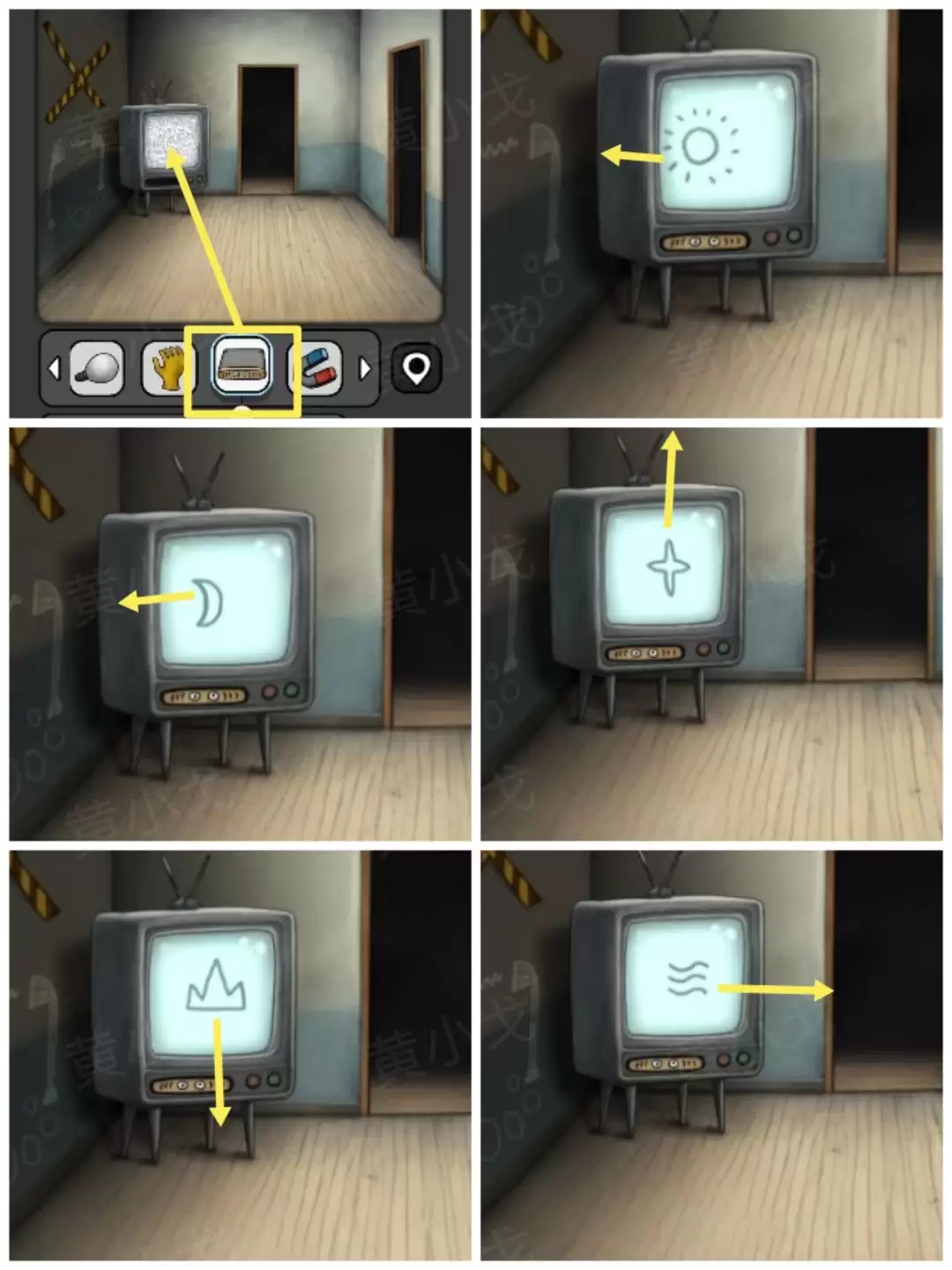 12. 找到电视机,把【录像带】插进插槽。播放时,屏幕上会依次出现图案并朝特定方向消失,一定要按顺序记好:太阳-左、月亮-左、星-上、山-下、波浪-右。