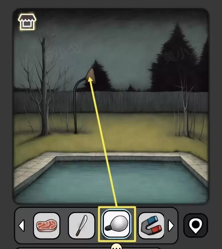 28. 泳池边的灯是坏的。把从小男孩房间拿的【灯泡】装上去,灯亮的同时,鱼怪也会出现。