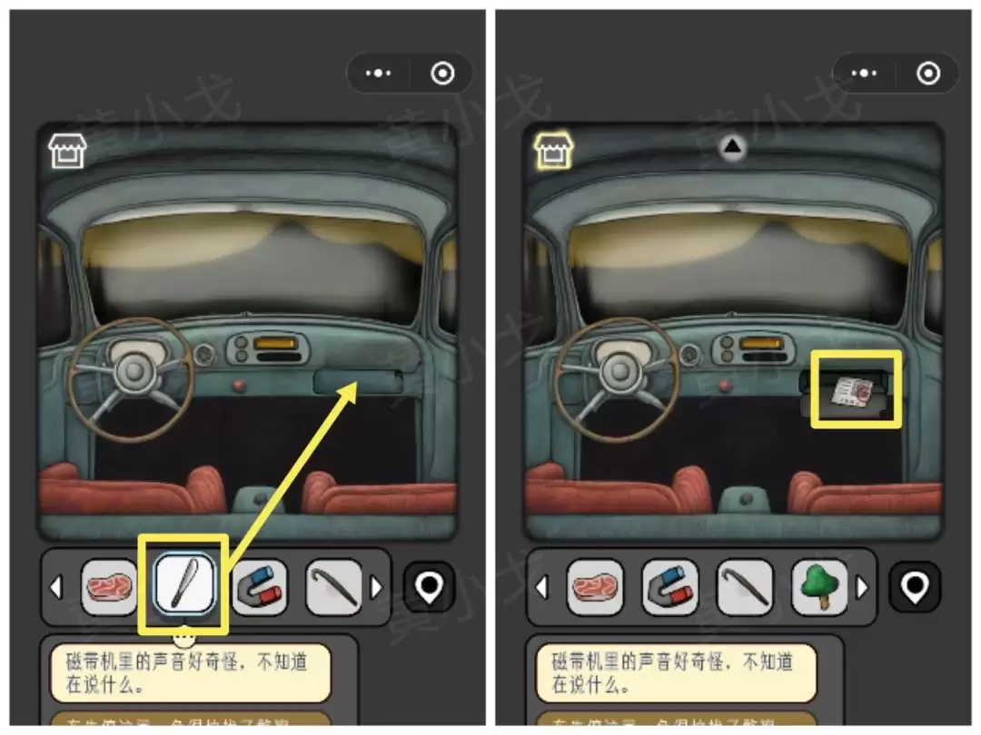 10. 回到汽车那里。用【磁铁】伸进收音机里,可以吸出一盒【录像带】。操作完成后,记得把磁铁拿回来,它还有用。