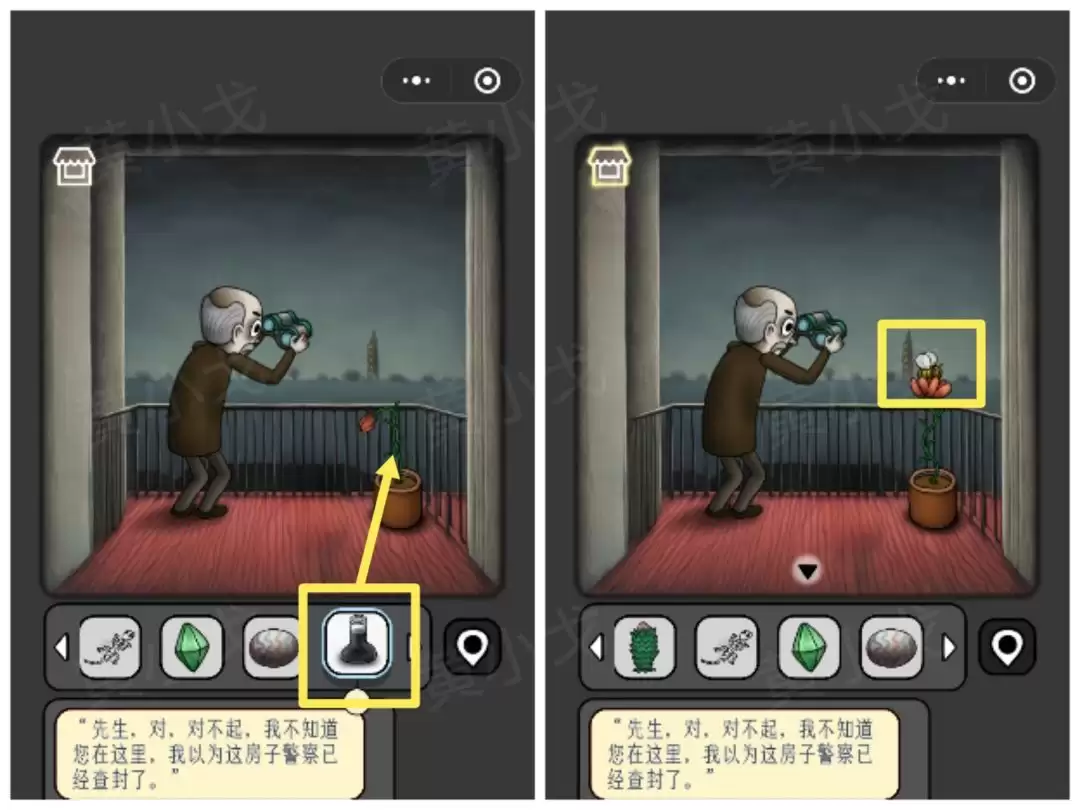 33. 接着,把【黑色液体】倒进老爷爷旁边的花盆里。花朵瞬间绽放,会吸引来一群【蜜蜂】。