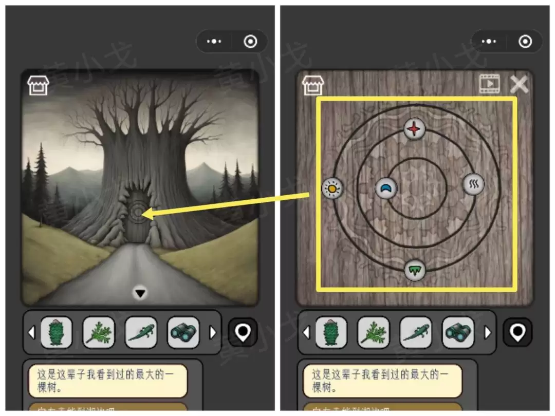 18. 点击大树上的机关,这是一个密码锁。根据刚才电视机里图案消失的方向来调整:太阳-左、月亮-左、星-上、山-下、波浪-右。
