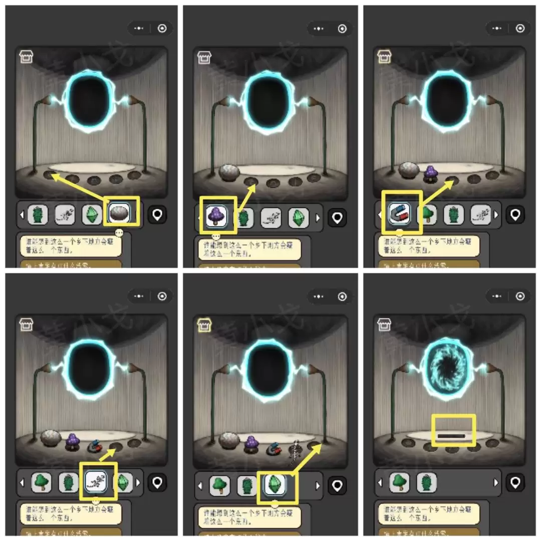 41. 机关解开后,地上会出现一个阵法。根据阵法中的图案提示,将【蛋】、【紫蘑菇】、【磁铁】、【骨头】和【宝石】这五样物品,放入对应的位置。阵法激活,合成出【能量棒】。