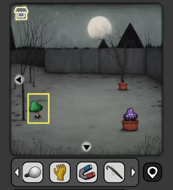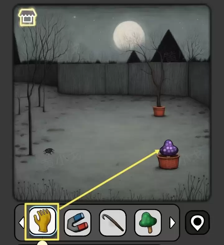 27. 另一个盆里长着【紫蘑菇】,但直接摘有危险。戴上之前捡的【手套】,就能安全摘取了。