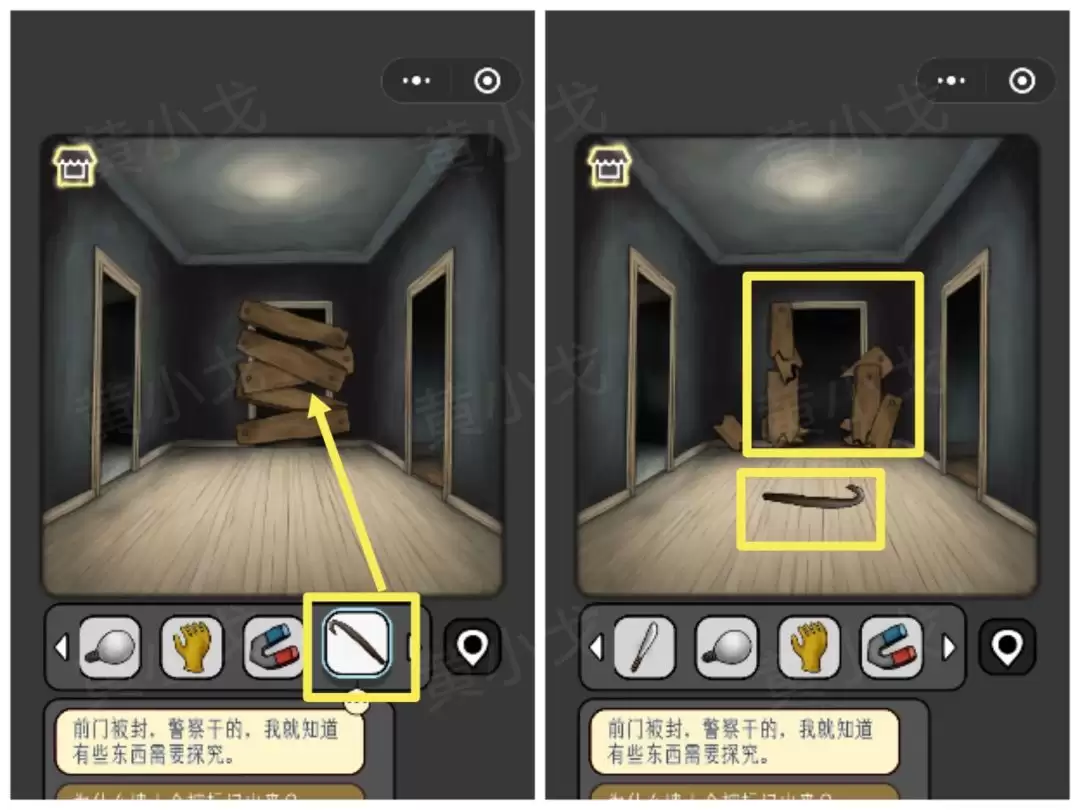 25. 来到被封住的前门,用【撬棍】把木板撬开。门开之后,撬棍别落下,后面还得用。