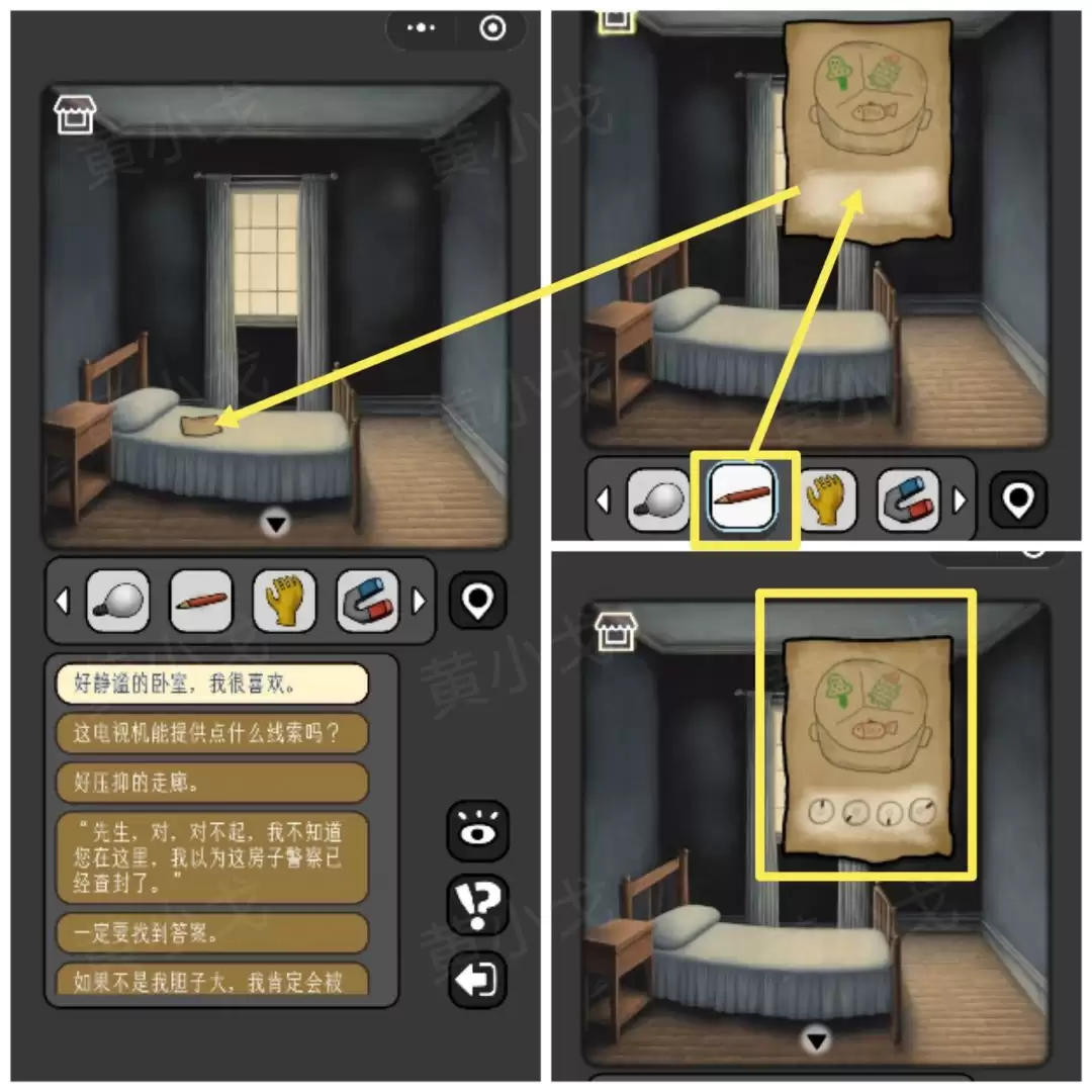 7. 再次回到床边,点击床上那张看似空白的纸条。用刚得到的【铅笔】在上面涂抹,隐藏的线索就会浮现出来:上、左下、下、右上。记牢这个顺序。
