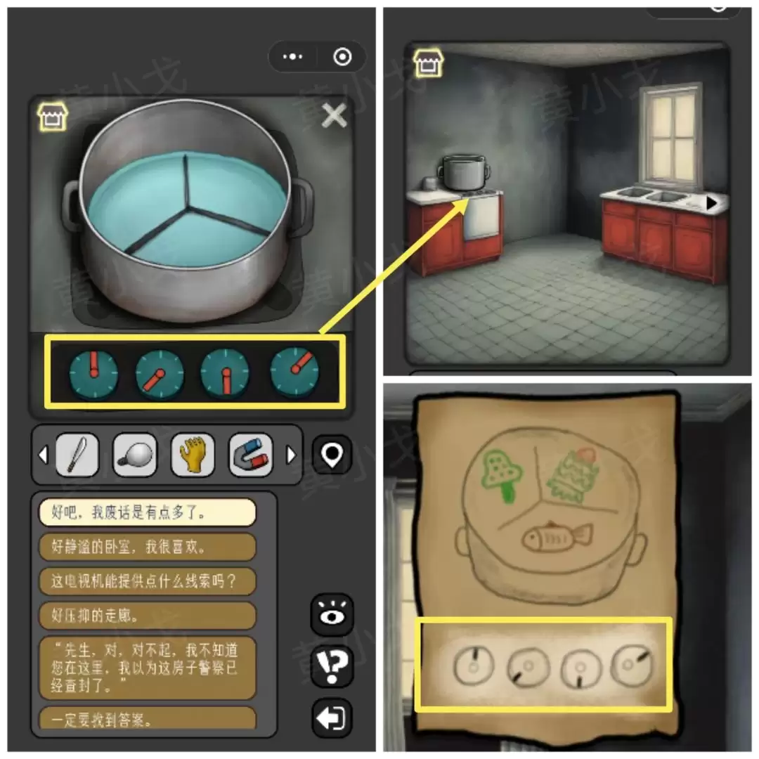 34. 回到厨房,点击炉灶上的机关。还记得床上纸条的线索吗?按照“上、左下、下、右上”的顺序来调整旋钮。