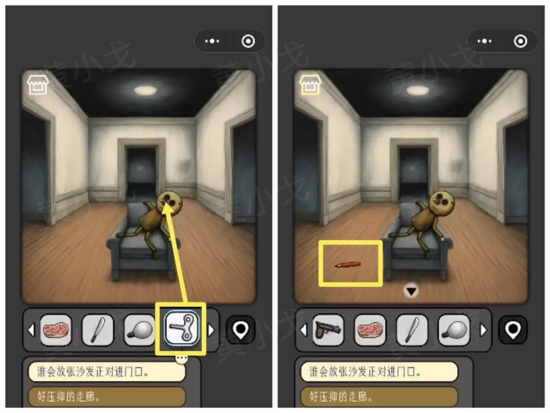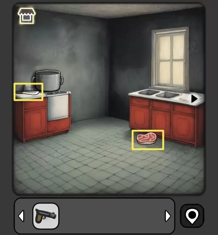 2. 接着转到厨房。别急着走,地上有块【肉】,橱柜上还放着一把【刀】,统统收起来。
