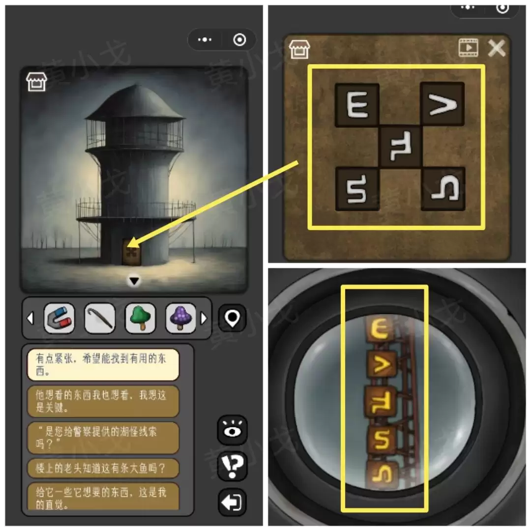 29. 把驯服的【蜥蜴】喂给鱼怪。鱼怪会吐出一根【骨头】。同时,注意看墙上新出现的图案,记下来。