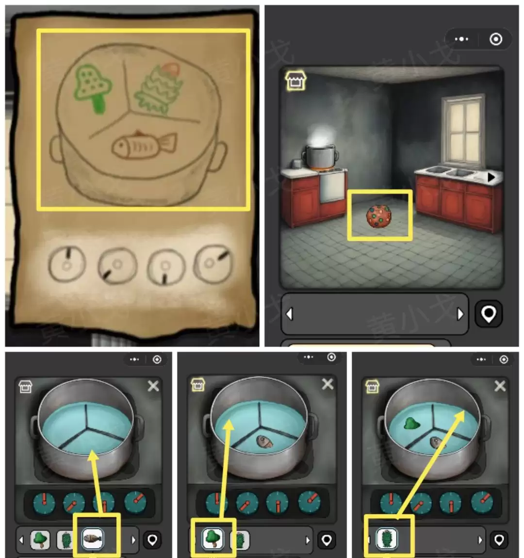 35. 旋钮调对后,根据线索提示,将【鱼】、【绿蘑菇】和【植物】一起放入锅中烹煮。你会得到一个奇怪的【肉球】。