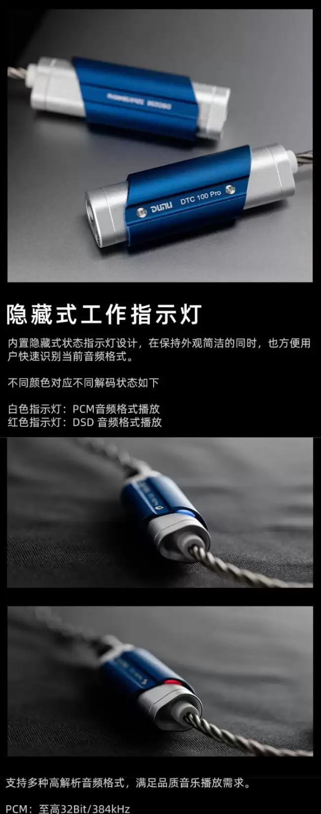 在工艺与实用性设计上,DTC 100 Pro同样考究。机身采用全铝合金CNC一体成型,辅以阳极氧化表面处理,兼顾了轻量化与结构强度。其紧凑的形态确保了极佳的便携性。设备还集成了隐藏式指示灯,可直观显示当前音频码流状态(如PCM或DSD),便于用户快速识别音源格式。