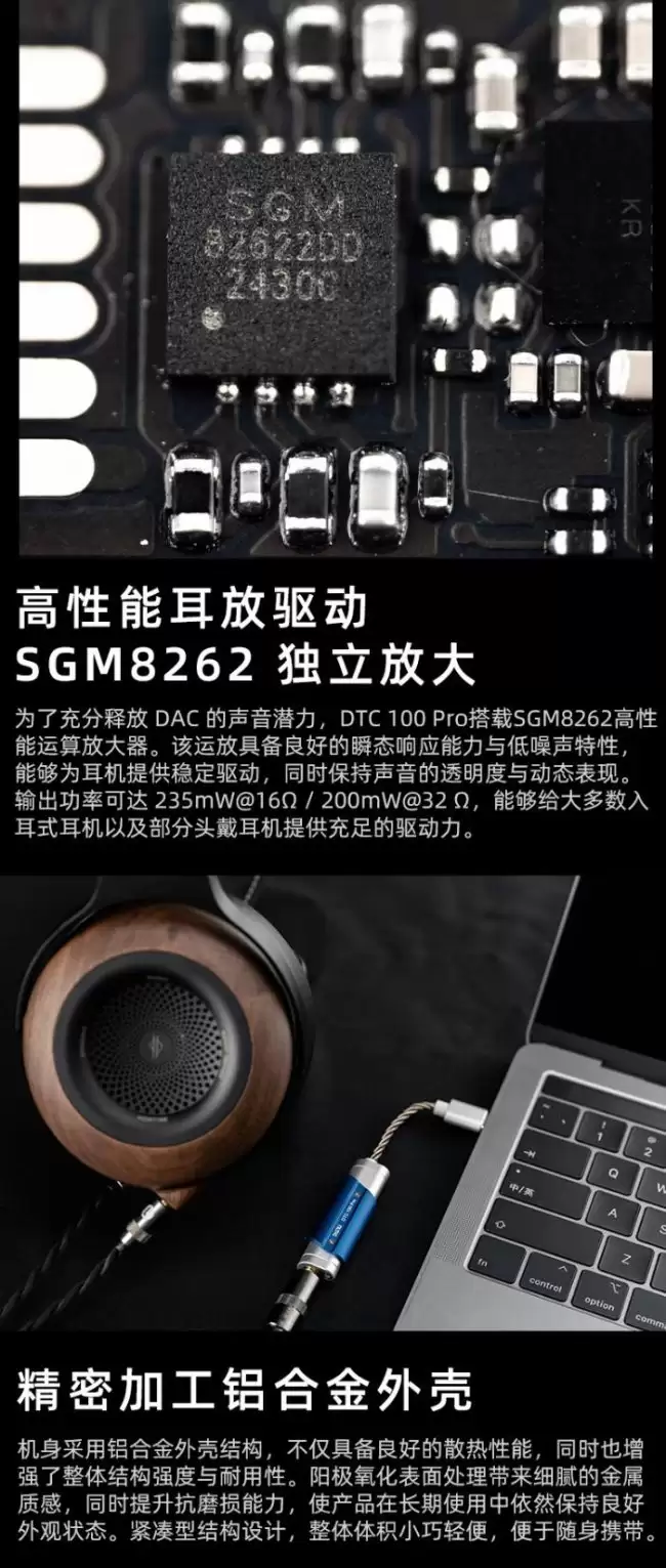 DTC 100 Pro的性能基石源于其核心架构。设备采用了Cirrus Logic CS43198解码芯片,该芯片以其优秀的信噪比和低失真特性,常见于中高端音频解决方案。配合独立的SGM8262运放芯片,系统实现了出色的瞬态表现与背景黑度。具体输出能力为235mW@16Ω或200mW@32Ω,这一推力水平足以从容驱动绝大多数高阻抗入耳式耳塞,并能满足部分便携头戴耳机的功率需求,显著提升移动设备的音频回放质量。