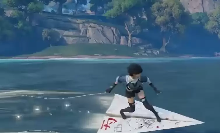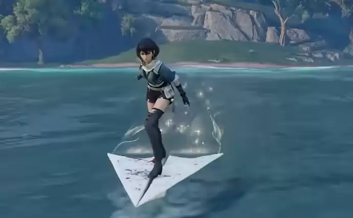 在游戏商城中,你可以找到这架纸飞机载具。使用它时,角色会以站立姿势立于其上,这与大多数载具的乘坐方式保持一致。不过,它的二段跳动作并未配备专属特效,对于追求华丽视觉反馈的玩家来说,可能会觉得此处略显平淡。但别急,纸飞机有一个设计相当出彩:它的拖尾特效特别长。飞行过后,留下的轨迹能延伸至很远,在视觉上形成一道持久的流光,观感上确实颇具特色。